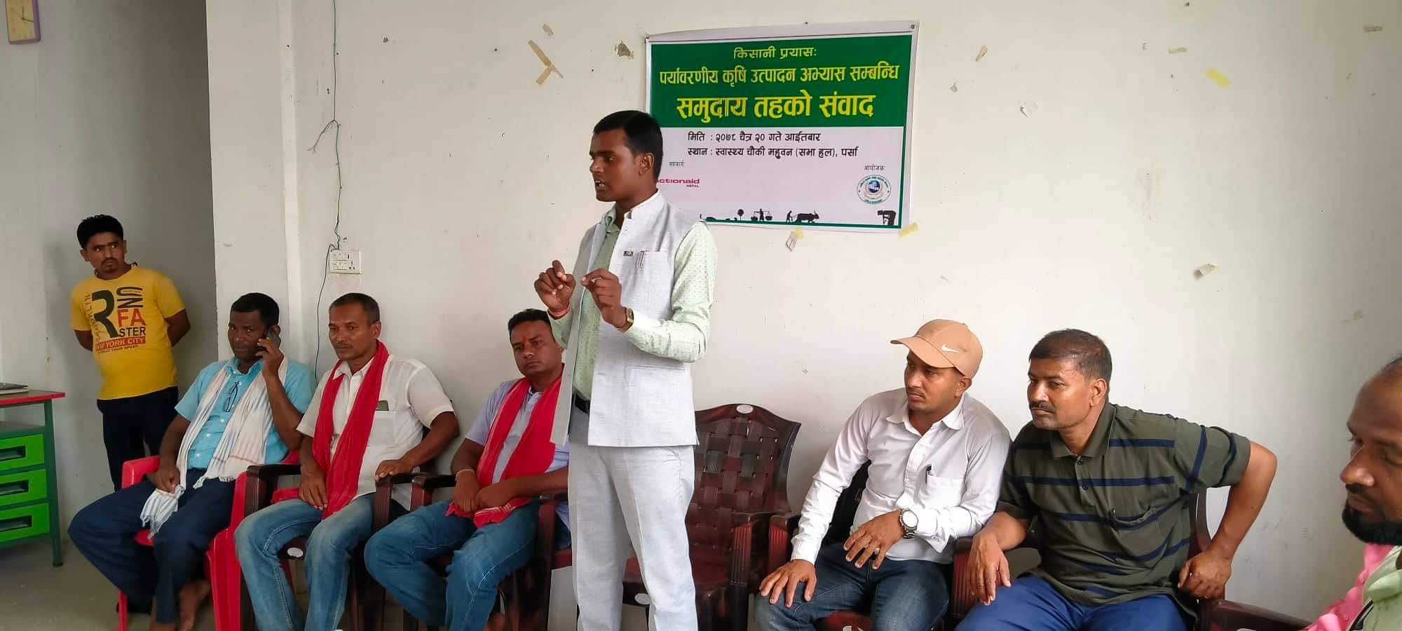 राष्ट्रिय कृषक समूह महासंघ नेपाल र एक्सन एड इन्टरनेशनल नेपालको पर्यावरणीय कृषिमा भएका नीति, बजेट र कार्यान्वयनको अवस्था विश्लेषण, समूदाय तहमा परामर्श र राष्ट्रियस्तरमा नीतिगत संवादलाई अगाडी बढाउन गइरहेको छ । सामुदाय तहमा परामर्श गरी कथा सङ्कलन गर्नका लागि सातै प्रदेशका ४८ वटा पालिकामा सञ्चालन भइरहेको कार्यक्रम अन्तर्गत पर्सा जिल्लाको सखुवा प्रसौनी गाउँपालिकामा पनि संवाद कार्यक्रम सम्पन्न भएको साहले बताए।